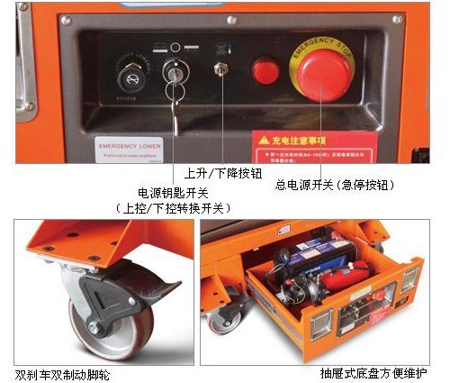 • 充電指示燈 • 平臺(tái)自鎖門 • 水平指示器 • 安全檢修支撐桿