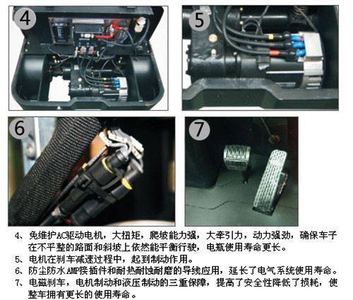 • 免維護(hù)AC驅(qū)動(dòng)電機(jī),大扭矩,爬坡能力強(qiáng),大牽引力,動(dòng)力強(qiáng)勁,確保車子在不平整的路面和斜坡上依然能平衡行駛,電瓶使用壽命更長。