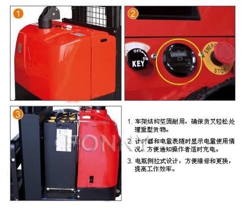 • 緊急反向行駛功能,在向后行駛過程中,一旦操作者背后碰到物體,操作者會自然反應用身體撞擊手柄反向按鈕,車子立即緊急反向行駛,使操作者避免受到傷害。