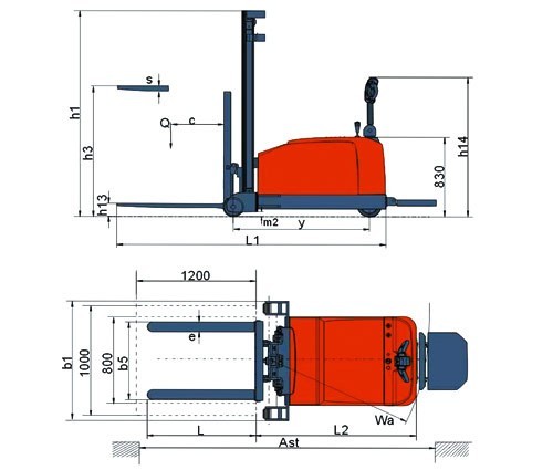 直角堆垛通道寬度,踏板收起/放下(托盤0.8 x 1.2m,1.2m沿貨叉放置,間隙200) |