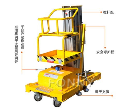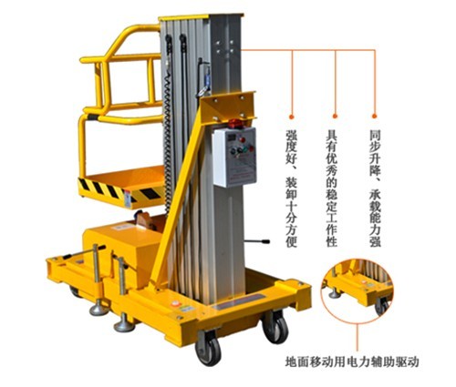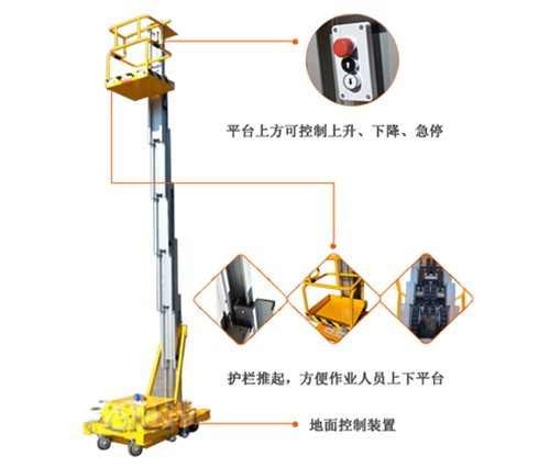 • 升降桅柱全部用高強(qiáng)度鋁合金型材,整機(jī)重量輕,移動(dòng)十分輕便;