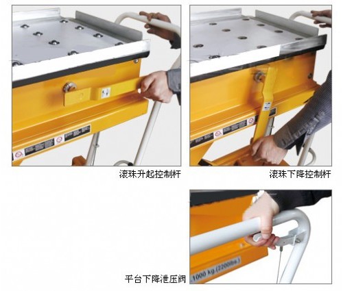 • 鋼珠被提升時,臺面上的貨物更易于搬運;鋼珠被下降時,貨物穩固地位于臺面上;